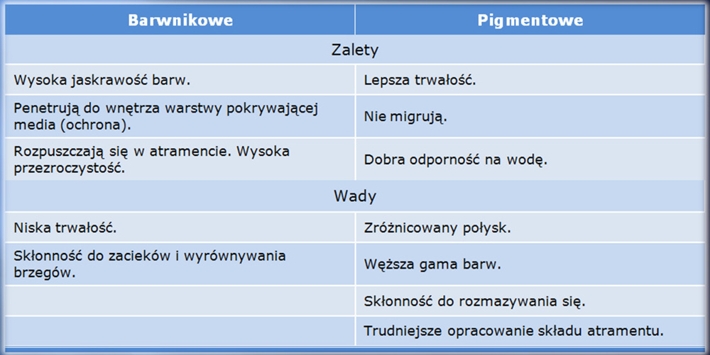 Konsekwencją właściwości barwników i pigmentów są następujące wady i zalety odpowiednich atramentów: