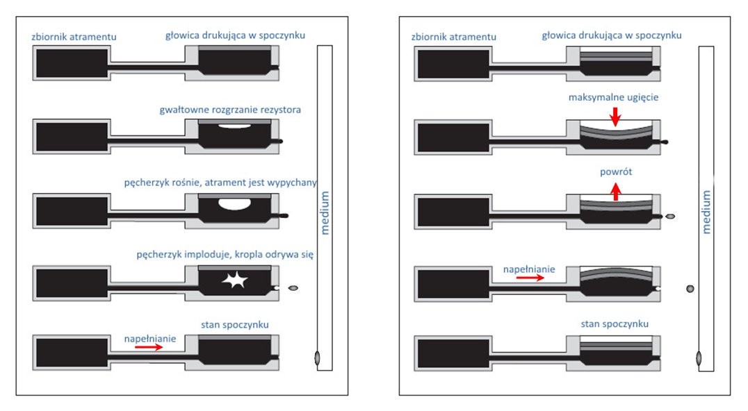 Termiczny druk atramentowy opiera się na założeniu, że gdy ciecz jest odparowywana, jej objętość znacznie się zwiększa. W termicznej głowicy drukującej atrament jest podgrzewany przez rezystor i tworzy się pęcherzyk pary. Ciśnienie wewnątrz komory wzrasta z powodu wzrostu pęcherzyka, a kropla jest wypychana przez dyszę. Gdy ciepło zostaje nagle odcięte, kropla uwalnia się, a pęcherzyk opada z powrotem na grzałkę. W tym samym momencie ciśnienie spada, a komora napełnia się atramentem ze zbiornika atramentu i cykl rozpoczyna się od nowa.