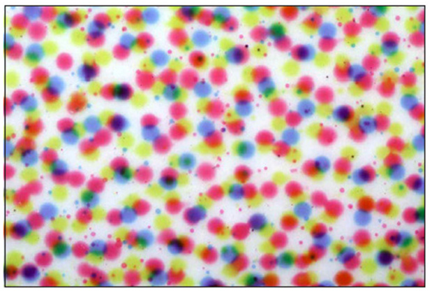 Obraz jest tworzony z punktów (kropek). Różne barwy powstają poprzez nakładanie się podstawowych kolorów na siebie. Powiększenie 50 x . Widoczne są tzw. satelity punktów.